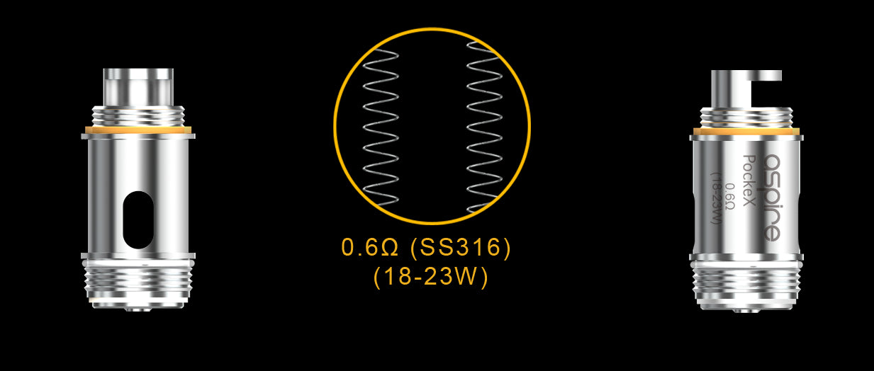 Aspire Pockex Coil / Atomizer HeadRated 18-23 watts, the PockeX Atomizer has a 0.6Ω 316L stainless steel coil. The PockeX...